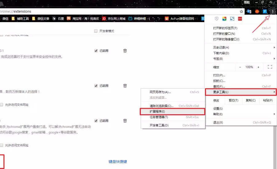 chrome://extensions/ - 或菜单 → 更多工具 → 扩展程序
